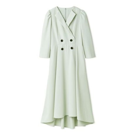 フロントのスコッチボタンは飾りなので後ろのコンシールで着脱できます。後ろウエストはシャーリング仕様で程よく体にフィット、裾は前後で差寸を付けることで足元は軽く、後ろ姿はエレガントに仕上げました。