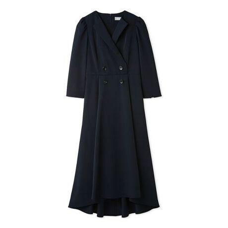フロントのスコッチボタンは飾りなので後ろのコンシールで着脱できます。後ろウエストはシャーリング仕様で程よく体にフィット、裾は前後で差寸を付けることで足元は軽く、後ろ姿はエレガントに仕上げました。