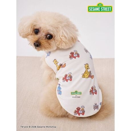 エルモ、クッキーモンスター、ビッグバード、オスカー、そしてアーニーとバートをランダムにプリントした総柄の犬猫用プルオーバーです。それぞれのキャラクターの傍には、ピケブルーのボーダー柄のモコモコをまとったアイテムが描かれているのがポイント。オフホワイトベースの柔らかなカットソー素材で、季節を問わず着用いただけるアイテムです。オーナー様のルームウェアと合わせてリンク・コーディネートもお楽しみいただけます。