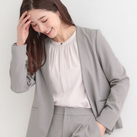 ミニマルなデザインながらも、衿ぐり〜前端にパイピングを挟み込んだディテールがポイントのベーシックなカラーレスデザイン。