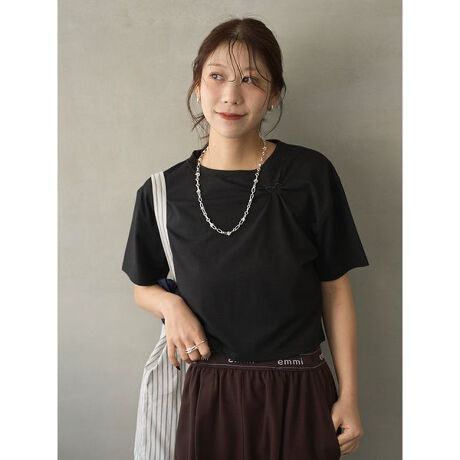 洗練されたemmiのnewロゴデザインの刺繍が目を引く、シンプルながらにデザイン性のあるクロップド丈Tシャツ。