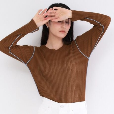 ・身体に程よくフィットするリブ編地で、甘く編立てややシアー感のある編地に仕上げています。