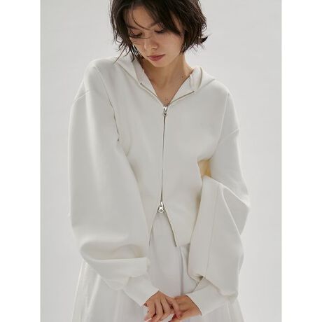 きれいめに着こなせる、ダンボール素材のジップフーディー。程よいハリ感と裾の控えめなバルーンラインがやわらかな印象をプラスします。ダブルジップ仕様で着こなしの幅が広がり、気温や気分に合わせたアレンジも自在。