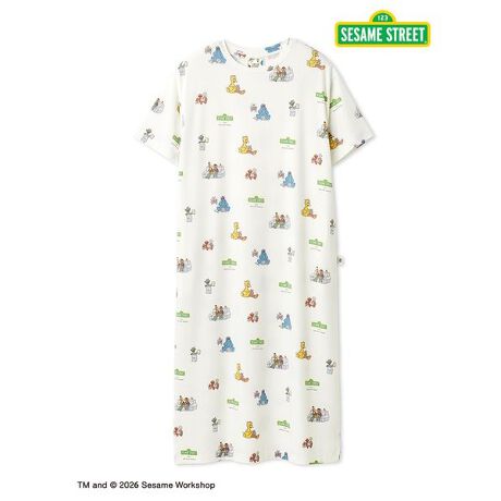 エルモ、クッキーモンスター、ビッグバード、オスカー、そしてアーニーとバートをランダムにプリントした総柄の半袖ワンピースです。それぞれのキャラクターの傍には、ピケブルーのボーダー柄のモコモコをまとったアイテムが描かれているのがポイント。オフホワイトベースの柔らかなカットソー素材を使用し、くびれのないシルエットなのでリラックスした着用感です。両脇にポケットがついているのもうれしいポイント。同シリーズのカーディガンを羽織るのもおすすめ。メンズ、キッズ、ベビーとのリンク・コーディネートもお楽しみいただけます。
