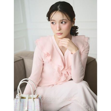 チュールを重ねることで奥行きのあるデザインに仕上げました。身頃はリブ編みで伸縮性も抜群のため体に心地よくフィットします。