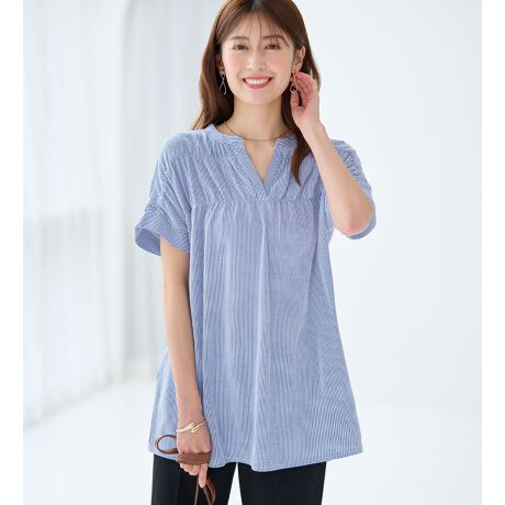 顔まわりをすっきり見せるキーネック&ギャザーデザインがふんわり立体的なシルエット。