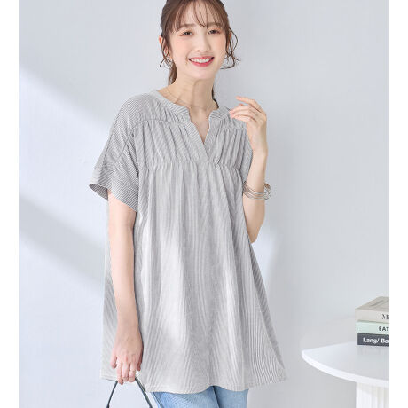 顔まわりをすっきり見せるキーネック&ギャザーデザインがふんわり立体的なシルエット。