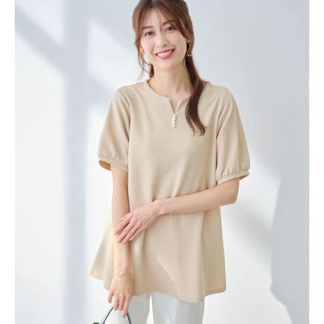 柔らかエンボス素材パール調ボタンチュニック