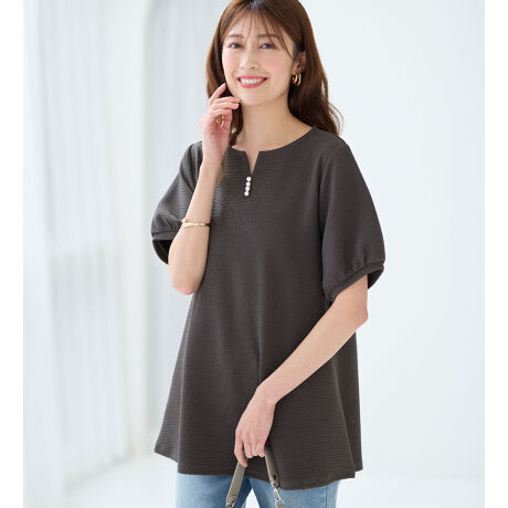 柔らかエンボス素材パール調ボタンチュニック