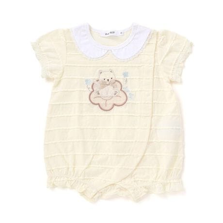 フロントに施した可愛いアニマルパッチが目を引く、女の子ベビー用カバーオール。