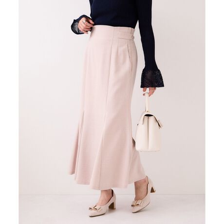 ウエストのサイドベルトがデザインポイントでもあり、アジャスターとしての機能性もある細見えするシルエットのマーメイドスカートです。