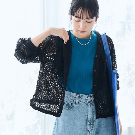ほどよい透け感のあるレース素材で、軽やかな印象に。ロングシーズン活躍する一枚です。