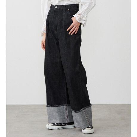 直線的でゆったりとした太めのシルエットが特徴のルーズストレート。裾に施した大きなロールアップのディテールがこのデニムのアイコン。ウエストにはタックを入れ立体的な見え方に。カジュアルなスタイリングに抜け感とモードな個性をプラスした映えアイテム。
