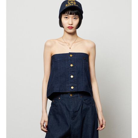 ライダースジャケットのディティールをギュッと凝縮した、エッジの効いたデニムビスチェです。