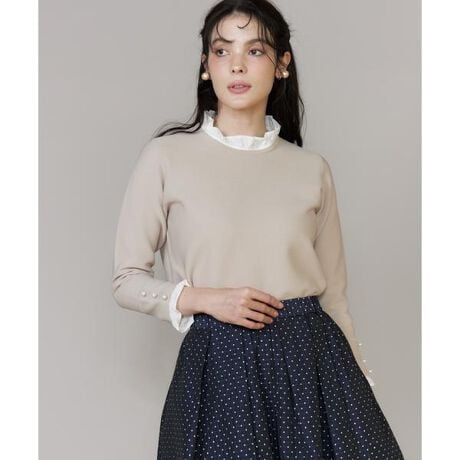 ■デザインプチハイネックがクラシカルな印象のニットプルオーバー。ブラウス生地のフリルの立体感が顔まわりや手元に華やかさを添え、着映え力も抜群です。一枚でレイヤード見えが叶うニットトップスで、程よく身体にフィットするサイジングで、ジャケットやカーディガンのインナーとしてもすっきりと着られる一枚です。■素材発色が良く、伸縮性に富んでおりスポンディッシュで柔らかく、軽量なのが特徴です。編地のパーツの段階で一度蒸気で縮める工程を経ています。そのためこれ以上縮むことがなく、水で手洗いであれば家庭洗濯が可能です。・バックボタンあり・衿フリル取り外し可・袖フリル取り外し可・水洗い可■サンプル撮影商品画像の商品はサンプルです。実際の商品とはサイズや色味、素材、デザイン等の仕様が若干変更になる場合がございます。■カラーについては、可能な限り実際の商品に近いカラーにて撮影をおこなっておりますが、照明の関係により実際の製品とは色味が違って見える場合があります。またパソコン・スマートフォンなどの環境により、若干製品と画像のカラーが異なる場合もございます。現物と画像のカラー差異については返品理由となりませんので、予めご了承ください。■サイズ表記はあくまで目安となります。