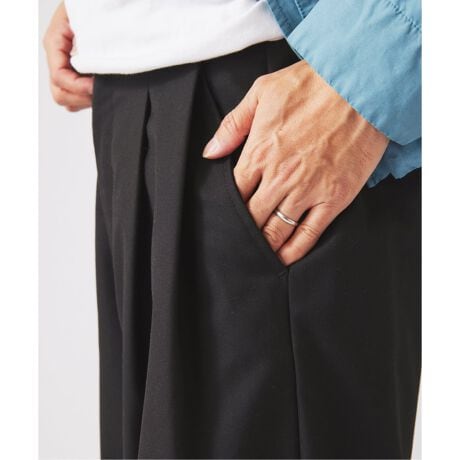 素材感:サラッとしたポリエステルベースの生地。適度な落ち感があり、動いた時のシルエットが綺麗です。