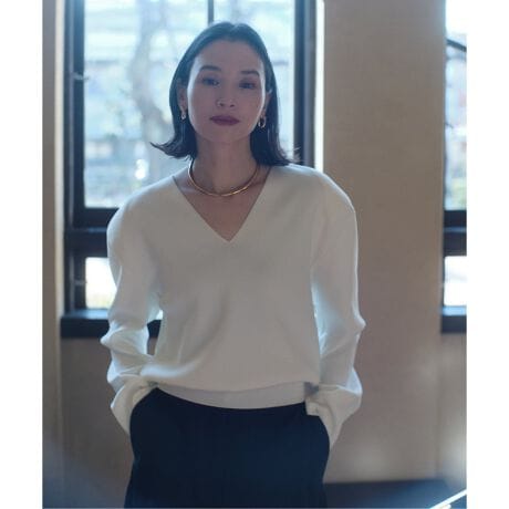 華奢に仕上げたVネックの襟ぐりが女性らしさを引き立てます。