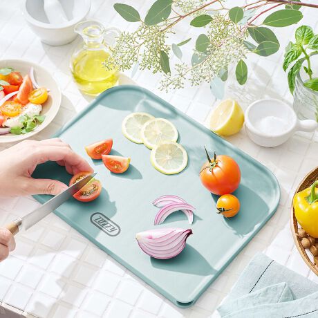 ひっくり返すと便利な水切りトレーとして使える、1枚2役の抗菌仕様のカッティングボード。
