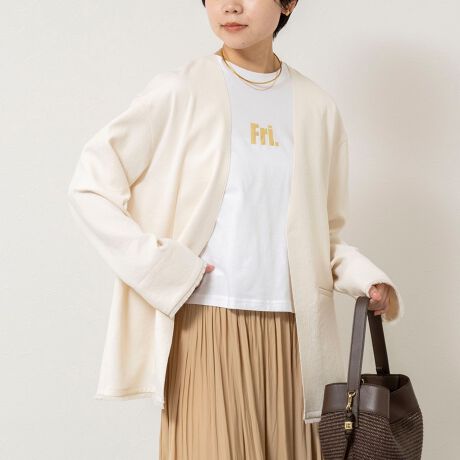 ・ノーカラーのシンプルなデザインが顔まわりをすっきりと見せ、どんなインナーとも合わせやすい一枚