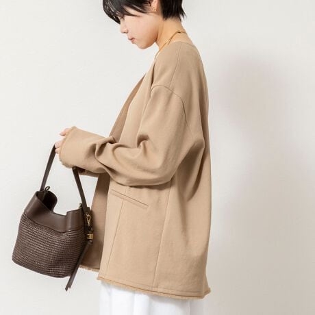 ・ノーカラーのシンプルなデザインが顔まわりをすっきりと見せ、どんなインナーとも合わせやすい一枚