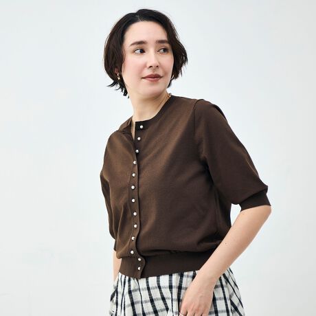 ・フロントのパールボタンがアクセサリー効果も高いカーデ