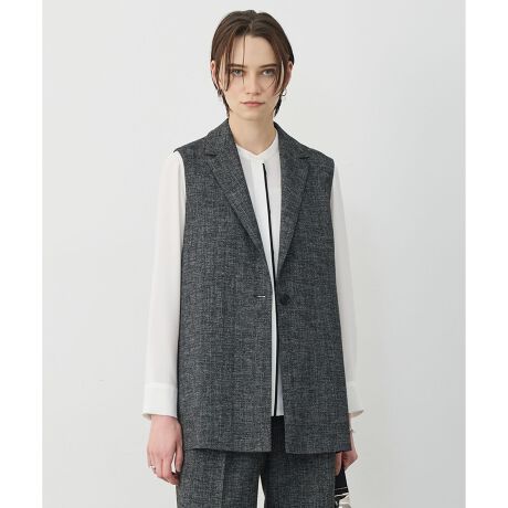 ■デザインシンプルでありながら、バックスタイルで差がつくデザインジレです。フロントはミニマルなシングル仕立てで、洗練された大人の印象に。直線的なラインがすっきりとした縦長シルエットを演出し、羽織るだけでスタイルアップが叶います。背中には大胆なスリットを施し、軽やかなデザインに仕上げました。抜け感のあるディテールが、後ろ姿まで美しく魅せてくれます。シャツやカットソーに重ねるだけでコーディネートがぐっと旬顔になるアイテムで、単品使いはもちろん、同シリーズのパンツと合わせてセットアップでの着用もおすすめです。