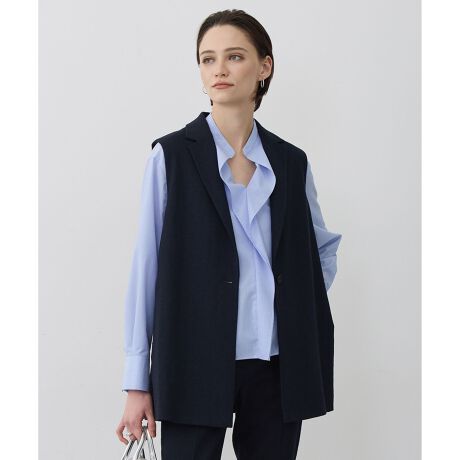 ■デザインシンプルでありながら、バックスタイルで差がつくデザインジレです。フロントはミニマルなシングル仕立てで、洗練された大人の印象に。直線的なラインがすっきりとした縦長シルエットを演出し、羽織るだけでスタイルアップが叶います。背中には大胆なスリットを施し、軽やかなデザインに仕上げました。抜け感のあるディテールが、後ろ姿まで美しく魅せてくれます。シャツやカットソーに重ねるだけでコーディネートがぐっと旬顔になるアイテムで、単品使いはもちろん、同シリーズのパンツと合わせてセットアップでの着用もおすすめです。