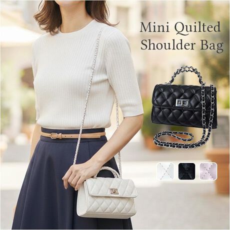 【デイリー使いの相棒】気分で2way、キルティングが映えるミニキルトショルダー♪【2wayスタイル】長めのショルダーストラップで肩掛けと斜め掛けができ、気分で使い分けできる◎※ショルダーストラップは取り外しできません。【上品キルティングデザイン】ふっくらとしたキルティング生地にシルバー金具が映える大人っぽくて上品な仕上がり。【ポケット付き】内側にファスナーポケットがあり、小物をスマートに整頓!【ちょうどいいコンパクトサイズ】お出かけに必要なアイテムだけをすっきり入れられる絶妙なサイズ感。