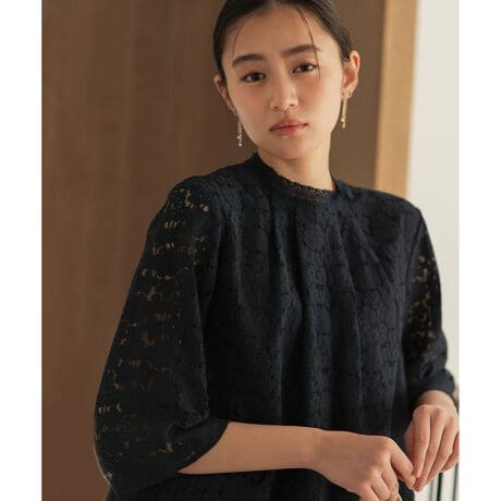 ■デザイン・スタンド襟にテープレース、総レースの胸元にタックをあしらったシンプルな7分袖のTブラウスは綺麗めスタイルにもカジュアルスタイルにも大活躍間違いなし。・身頃部分にトリコット裏地を使用しているので着心地がよくインナーを迷わず即着可能なのも魅力。・袖はスッキリとした7分袖で甘くなりすぎず着用シーズンも長くお楽しみいただけます。