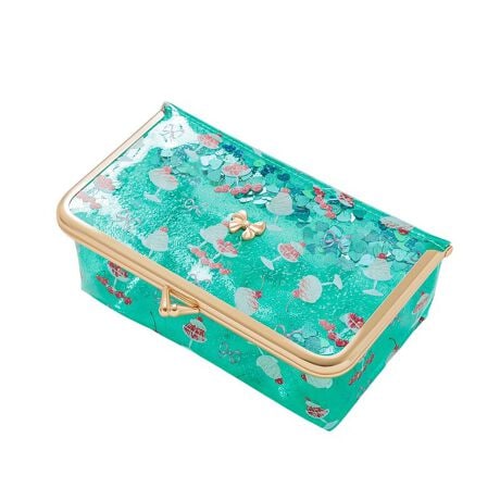 スパンコール入りクリアラメPVCのがま口バニティポーチにペパーミントデザート柄が登場! がま口ならではの可愛さと、大きく開いて中のものが取り出しやすい仕様がポイントです。