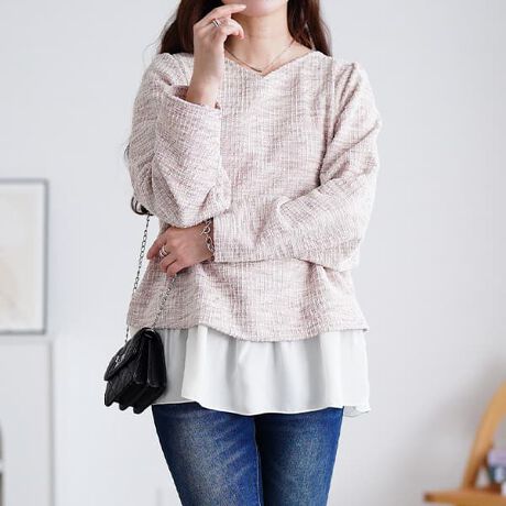 【大きいサイズ】 ツイードフェイクレイヤードプルオーバー 大きいサイズ レディース トップス