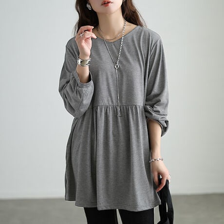 シンプルなカットソーに、甘いシルエットをひと匙加えることで、女性らしさと立体感のある一着。さっと着られる手軽さで、デイリーユースにぴったり。カジュアルながらも、綺麗め印象が漂うシルエットで、幅広いボトムスとの相性も抜群。ベルトなどの小物で遊びを加えても楽しめます。やや幅広のVネックがデコルテ映えし、顔周りをすっきり見えに。高めの切り替え位置で、自然と脚長効果を発揮します。ペプラムシルエット&安心のチュニック丈で、腰回りやヒップをふんわりカバーし、ゆったりとした着心地でボディラインを拾わず、上半身を丸ごと体型カバー。