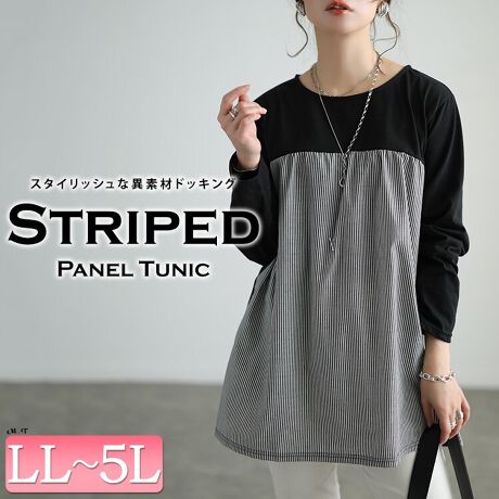 ベーシックなカットソー生地のパネルに、ストライプ柄の布帛生地をドッキングさせたチュニック。前後で異なる雰囲気を楽しめ、さっと着られる手軽さも嬉しいポイント。ビスチェのような切り替えデザインで女性らしさを演出し、ストライプ柄がスタイリッシュ感をプラスします。ブラックベースのカットソーと、ストライプの布帛生地の切り替えデザインで自然と華奢見え。ストライプ柄が着るだけで縦ラインを強調してくれるから、ゆったりなサイズ感でもすっきりとした印象に。ヒップを包み込んでくれる安心のチュニック丈で上半身を丸ごと体型カバー。