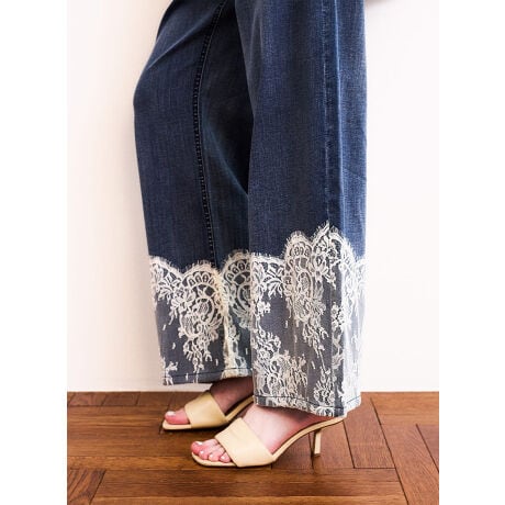 レース×デニムの異素材デザインがポイントの、ワイドデニムパンツ。