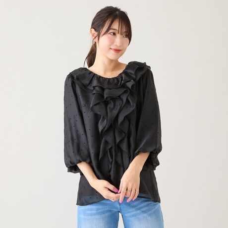 ・甘すぎないハートドットで、大人の可愛らしさを品よく纏うフリルブラウス