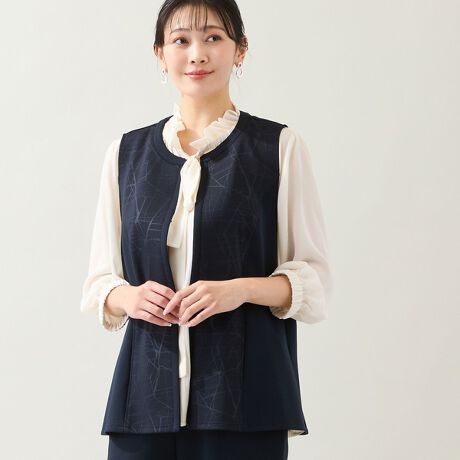程よいきちんと感を楽しめるベストは、フロントにエンボス加工で柄を入れたデザイン。さり気ない柄がアクセントになっています。
