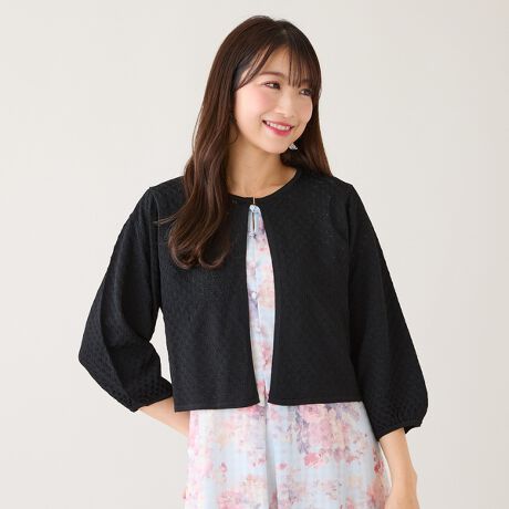 ・小さな飾りボタンひとつで留めるボレロ風デザインは、上品さと遊び心を両立