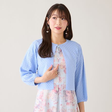 ・小さな飾りボタンひとつで留めるボレロ風デザインは、上品さと遊び心を両立
