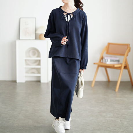 トップスとロングスカートが揃ったセットアップ。日常に取り入れやすい上下アイテムとして活躍する一着。リボンをあしらったキーネックデザインが縦の流れを作り、上半身をすっきりとした印象に。裾はドローコード仕様にすることでシルエットの調整が可能。スカートはロング丈ながら広がりすぎないフレアライン。腰まわりから裾にかけて自然な落ち感を演出、バランスの取れたスタイルが完成。春・秋・冬とロングシーズン活躍し、普段使いにも優秀。シンプル派にも取り入れやすいセットアップとしてワードローブに加えたくなる一着です。
