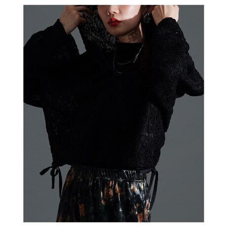 【トップス】 パーカー 花柄 刺繍 レース 長袖 ショート ドロスト ブラック アイボリー モカ