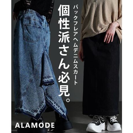 ケミカルウォッシュを施したブルーとブラックデニムが印象的なバックフレアヘムスカート。後ろに広がるシルエットが動きを生み、有りそうでなかった個性派デザインに。穿くだけでコーデがぐっと引き締まります☆