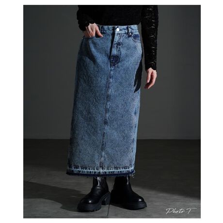 ケミカルウォッシュを施したブルーとブラックデニムが印象的なバックフレアヘムスカート。後ろに広がるシルエットが動きを生み、有りそうでなかった個性派デザインに。穿くだけでコーデがぐっと引き締まります☆