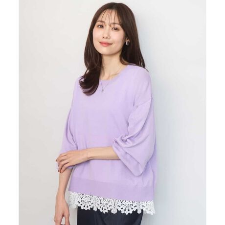 シンプルなクルーネックニットとトレンドの繊細なレースを裾にあしらったタンクトップのセットアイテム。裾からレースを覗かせるレイヤードスタイルがこれ一枚で完成します。