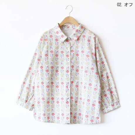 お出かけにぴったりの華やかなカラーが印象的なデザインブラウス。