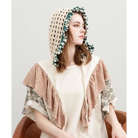 [型番:NWWP6109-2026]ひも付きの手編みキャップは、フードのようにアレンジしても楽しめる自由なデザイン。ゆったりサイズでリラックス感があり、ヒッピーやボヘミアンコーデにおすすめ。