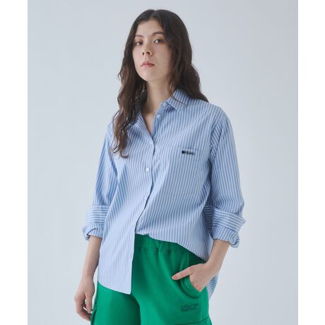 程よくゆとりのあるストレートシルエットで、リラックス感がありながらもすっきりとした印象に仕上げました。裾はラウンドカット仕様で、タックイン・アウトどちらのスタイリングにも対応。胸ポケットにあしらったブランドロゴ刺繍が、さりげないアクセントに。