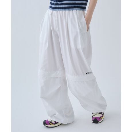 ワイドストレートシルエットに、膝位置を高めに設定することで、さりげないスタイルアップ効果も◎。裾はドローコードで調節でき、気分やシューズに合わせたシルエットアレンジが可能です。