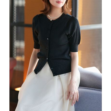 きらめくラメリブと、ふんわりパフが上品なフェミニンカーデ。