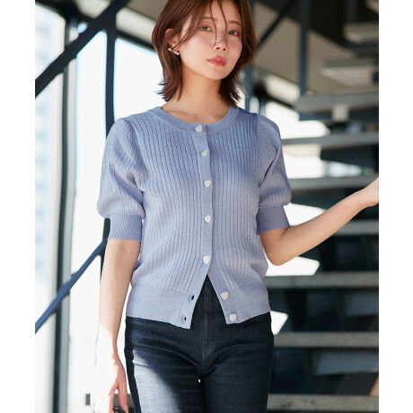 きらめくラメリブと、ふんわりパフが上品なフェミニンカーデ。