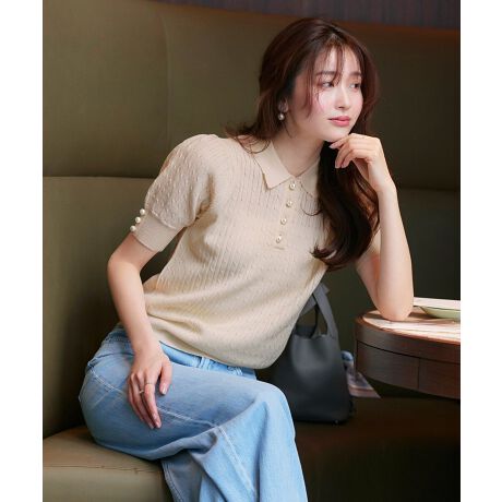 ポロ襟と上品なパールボタンがポイント。
